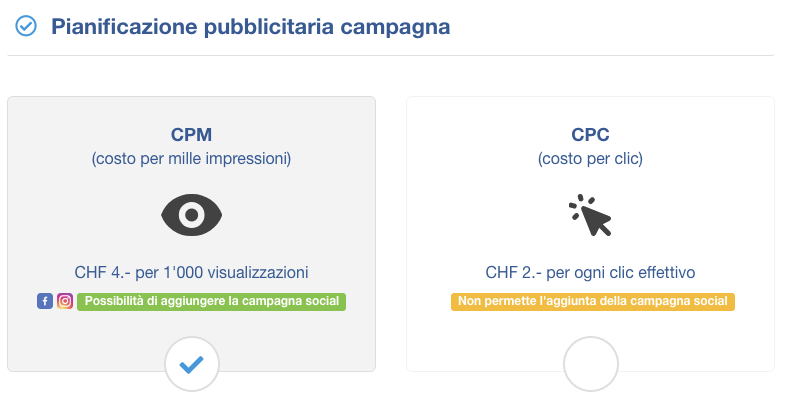 L'opzione Canali Social Ticinonline è disponibile solo per campagne a CPM.