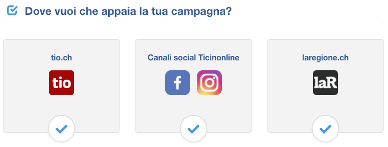 Puoi decidere di far apparire la tua inserzione solo su tio.ch, laregione.ch, oppure puoi includere i canali social di Ticinonline.